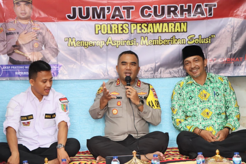Dalam kegiatan Jumat Curhat kali ini Kapolres Pesawaran menyampaikan bahwa giat semacam ini dilaksanakan sebagai upaya untuk menjalin silaturahmi serta lebih dekat dengan warga. Selain itu Jumat Curhat juga menjadi sarana bagi warga untuk menyampaikan aspirasi serta berbagai masalah yang ada di wilayahnya.“Giat seperti Jumat Curhat ini selain untuk menjalin silaturahmi tapi juga untuk memudahkan komunikasi dua arah dengan warga, seperti saat ini diwakili sama tokoh pemuda karang taruna” Ujar Kapolres Pesawaran.