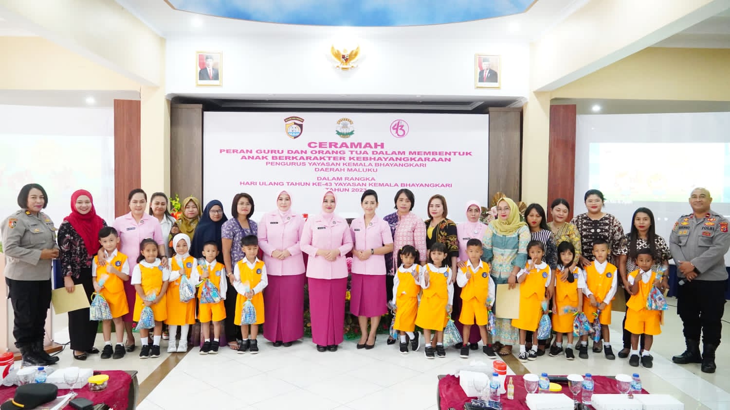 InvestigasiMabes.Com| POLDAMALUKU -- Ketua Pengurus Yayasan Kemala Bhayangkari (YKB) Daerah Maluku, Ny. Evi Lotharia Latif, mengajak para guru dan orang tua untuk dapat berperan dalam membentuk anak berkarakter Bhayangkara.Ajakan tersebut disampaikan Ny. Evi Lotharia Latif dalam sambutannya pada kegiatan ceramah menjelang HUT ke-43 Bhayangkari. Kegiatan berlangsung di aula kediaman dinas Kapolda Maluku, Tantui, Kota Ambon, Jumat (17/2/2023).