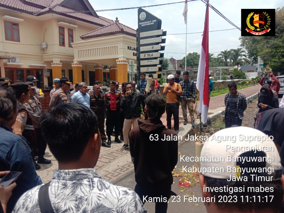 InvestigasiMabes.com | Banyuwangi – LDKS-PIJAR (Lembaga Diskusi Kajian Sosial Pilar Jaringan Aspirasi Rakyat) lakukan orasi dan teatrikal didepan kantor Kejaksaan Negeri Banyuwangi menuntut kelanjutan penyelesaian kasus Korupsi Pejabat Pemda Banyuwangi pada Kamis (23/2/2023).Kordinator dalam aksi tersebut, Mahfud Mahib menyampaikan bahwa kasus Korupsi Mamin fiktif ini agar segera diselesaikan, mengingat penetapan tersangka sudah lama dan anehnya hingga hari ini NH masih belum ditahan.