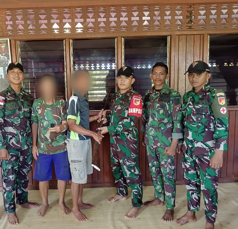 InvestigasiMabes, |KAPUAS HULU – Personel Satgas Pamtas RI-Malaysia Yonarmed 19/105 Trk Bogani Pos Jaung menerima penyerahan satu pucuk senjata api rakitan penabur jenis bowmen dan 2 butir munisi dari saudara MB (52) warga Dusun Jaung, Kecamatan Puring Kencana, Kabupaten Kapuas hulu, Kalimantan Barat.Hal tersebut disampaikan oleh Dansatgas Pamtas RI-Malaysia Yonarmed 19/105 Trk Bogani, Letkol Arm Edi Yulian Budiargo, S.Sos., M.Han. dalam rilis tertulisnya di Makotis Badau. Kamis (23/02/2023).