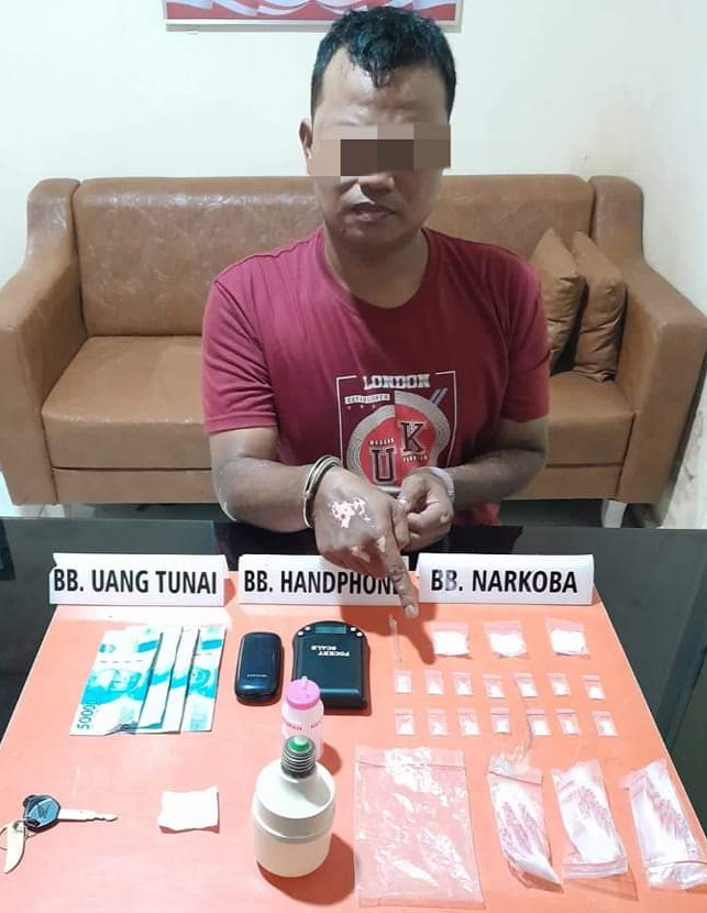 Penangkapan pelaku ini berhasil diamankan barang bukti 17 paket narkoba jenis shabu-shabu yang dibungkus dengan plastik bening, (Bruto 15.69 Gram), HP merk Samsung, timbangan digital, 3 ball plastik klip putih bening, lampu, kertas, bong, kaca pirek, uang Rp 200 ribu.Penangkapan pelaku ini berawal mendapat informasi dari masyarakat bahwasanya d seorang pelaku yang sering transaksi narkoba di jalan, tepatnya di Jalan Raya.