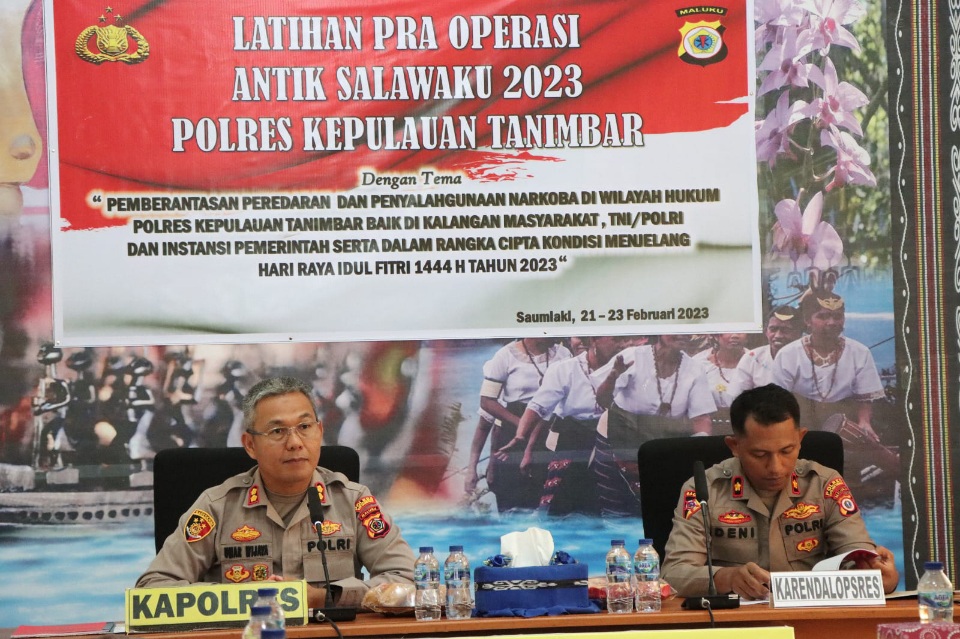 InvestigasiMabes, Maluku -- Pelaksanaan Kegiatan Latihan Pra Operasi Kepolisian dengan Sandi Antik Salawaku 2023 Polres Kepulauan Tanimbar ini yang Bertema Pemberantasan Peredaran dan Penyalahgunaan Narkoba di wilayah hukum Polres Kepulauan Tanimbar, baik dikalangan masyarakat, TNI / Polri dan Instansi Pemerintah serta dalam rangka cipta kondisi menjelang Hari Raya Idul Fitri 1444 H Tahun 2023.Kapolres Kepulauan Tanimbar AKBP Umar Wijaya, S.I.K., membuka kegiatan Lat Pra Ops Antik Salawaku 2023 ini dengan didampingi oleh Kabag Ops Kompol Frihamdeni, S.H, S.I.K, M.A. bersama Kasat Narkoba AKP Idris Mukadar, S.Hi