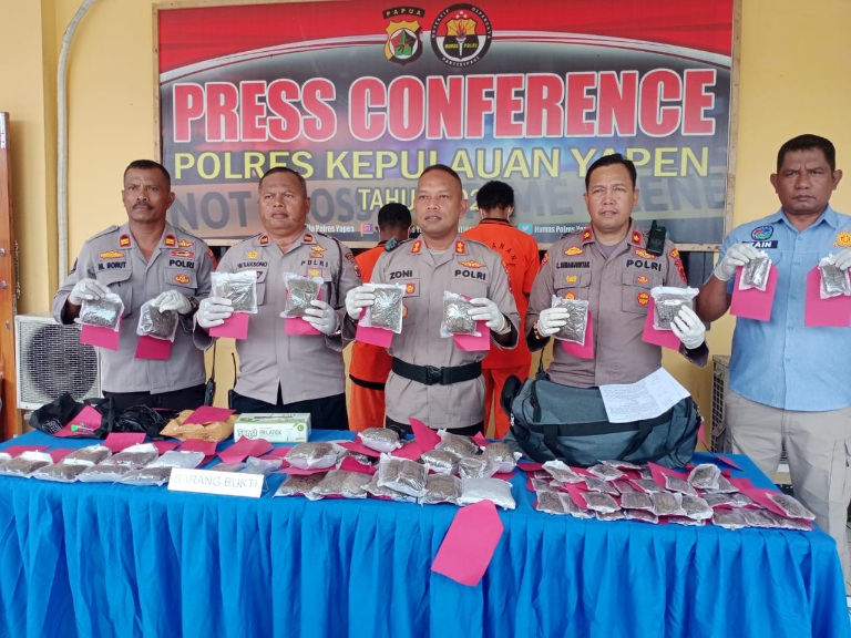 Dari pelaku berinisial RIW ini tim polres kepulauan Yapen berhasil mengamankan barang bukti narkotika jenis ganja seberat 247,7 gram.“Barang bukti ganja ini dikemas dalam satu kemasan rapi yang di lakban didalamnya berisi 10 paket narkoba terbungkus plastik bening,” ucap Kapolres AKBP Herzoni Saragih dalam konferensi pers, Kamis (9/3/2023).