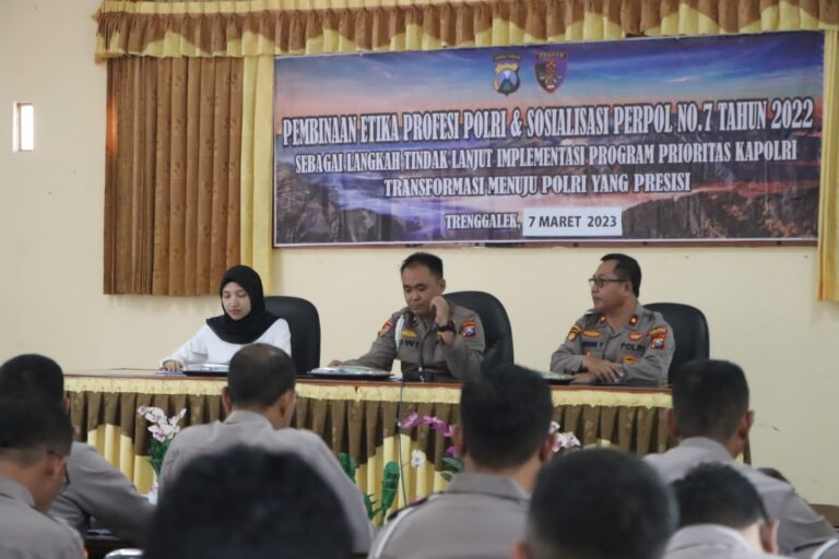 InvestigasiMabes.com | Polres Trenggalek – Profesionalisme merupakan kata keramat yang wajib dijunjung tinggi dan dijalankan oleh setiap anggota Polri dimanapun bertugas. Salah satu faktor pendukung di antaranya adalah kepatuhan dan ketaatan terhadap etika profesi sehingga Polri yang Presisi dapat benar-benar terwujud.Guna mendukung hal tersebut, Bidpropam Polda Jatim yang dipimpin oleh Kompol Dwi Jatmiko, S.H.,S.I.K., M.I.K. menggelar pembinaan etika profesi Polri bagi segenap anggota Polres Trenggalek yang digelar di Balai Benih Kabupaten Trenggalek Selasa (7/3).