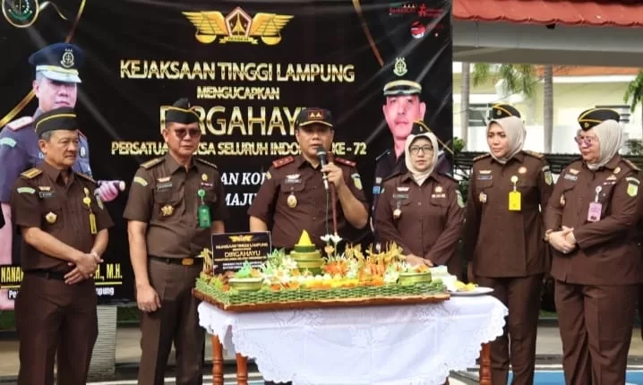 Investigasimabes.com l Bandar Lampung -- Bertempat di Halaman Kantor Kejaksaan Tingggi Lampung, dilaksanakan Upacara Peringatan Hari Ulang Tahun Persatuan Jaksa Republik Indonesia (PERSAJA) Ke -72 Tahun 2023 dengan tema “Sinergi dan Kolaborasi Demi Kemajuan Negeri” yang dipimpin langsung Kepala Kejaksaan Tinggi Lampung Nanang Sigit Yulianto S.H., M.H., dengan peserta Para Asisten, Kabag TU, Para Koordinator, Para Kasi, seluruh Jaksa dan Pegawai diingkungan Kejaksaan Tinggi Lampung, pada Senin (8/5/2023).Amanat Jaksa Agung Republik Indonesia ST Burhanuddin yang di bacakan oleh Kepala Kejaksaan Tinggi Lampung menyampaikan sebagai sebuah organisasi profesi yang juga menjadi sebuah wadah tempat berhimpunnya para Jaksa dalam memupuk jiwa korsa dengan semangat Kebersamaan, Kesatuan dan Persatuan, memperkukuh kesetiakawanan, meningkatkan integritas, dan profesionalisme Jaksa, PERSAJA tentunya sangat dibutuhkan dalam menopang pelaksanaan perannya sebagai Jaksa maupun dalam kehidupan sehari-hari agar setiap Insan Adhyaksa menyadari dirinya mampu menjadi teladan dan dapat memberikan contoh yang baik bagi lingkungan dimana pun ia berada.