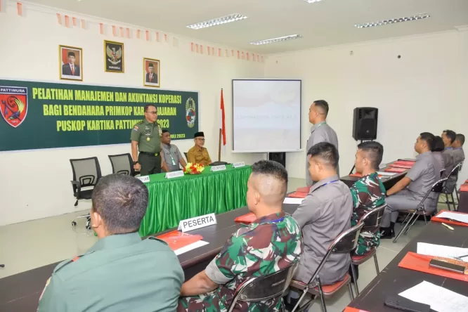 InvestigasiMabes.Com|Maluku-Untuk meningkatkan kemampuan Koperasi dalam menyajikan laporan keuangan dengan baik dan benar sesuai dengan Standar Akuntansi Keuangan (SAK) yang berlaku, maka Pusat Koperasi (Puskop) Kartika Pattimura menyelenggarakan Pelatihan Manajemen dan Akuntansi Koperasi Bagi Bendahara Primer Koperasi (Primkop) Kartika Jajaran Pusat Koperasi (Puskop) Kartika Pattimura TA 2023, bertempat di Aula Dinas Koperasi dan Usaha Mikro Kota Ambon, Karang Panjang, pada Senin (24/7/2023).Kegiatan yang berlangsung selama lima hari ini dibuka langsung oleh Kasdam XVI/Pattimura Brigjen TNI Agung Pambudi mewakili Pangdam XVI/Pattimura Mayjen TNI Ruruh A Setyawibawa. Pangdam dalam amanat yang dibacakan Kasdam mengatakan, dalam tata kelola Koperasi yang baik, sangat membutuhkan kemampuan untuk memahami sistem akuntansi dan manajemen pengelolaan keuangan pada Koperasi yang berlandaskan pada transparansi dan akuntabilitas.