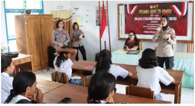 InvestigasMabes.Com| Saumlaki-Dalam menyambut hari jadi Ke-75 Tahun 2023, Polisi Wanita (Polwan) Polres Kepulauan Tanimbar menggelar Sosialisasi melalui giat Polwan Goes to School dengan tema", Polri Persisi Untuk Negeri, Polwan siap mendukung Pemilu Damai menuju Indonesia maju", Kamis 10/08/2023Kegiatan dimaksut berlangsung di 2 (dua) lokasi Sekolah yang berbeda yakni SMA Negeri 10 Kepulauan Tanimbar dan SMP Negeri 2 Kecamatan Tanimbar Selatan, yang dipimpin oleh Ps.Kasi Propam Ipda L.Herowaty bersama seluruh Polwan Polres Kab.Kepulauan Tanimbar yang dihadiri para Guru beserta Siswa-Siswi, dengan materi",Bijak dalam Bermedia Sosial.