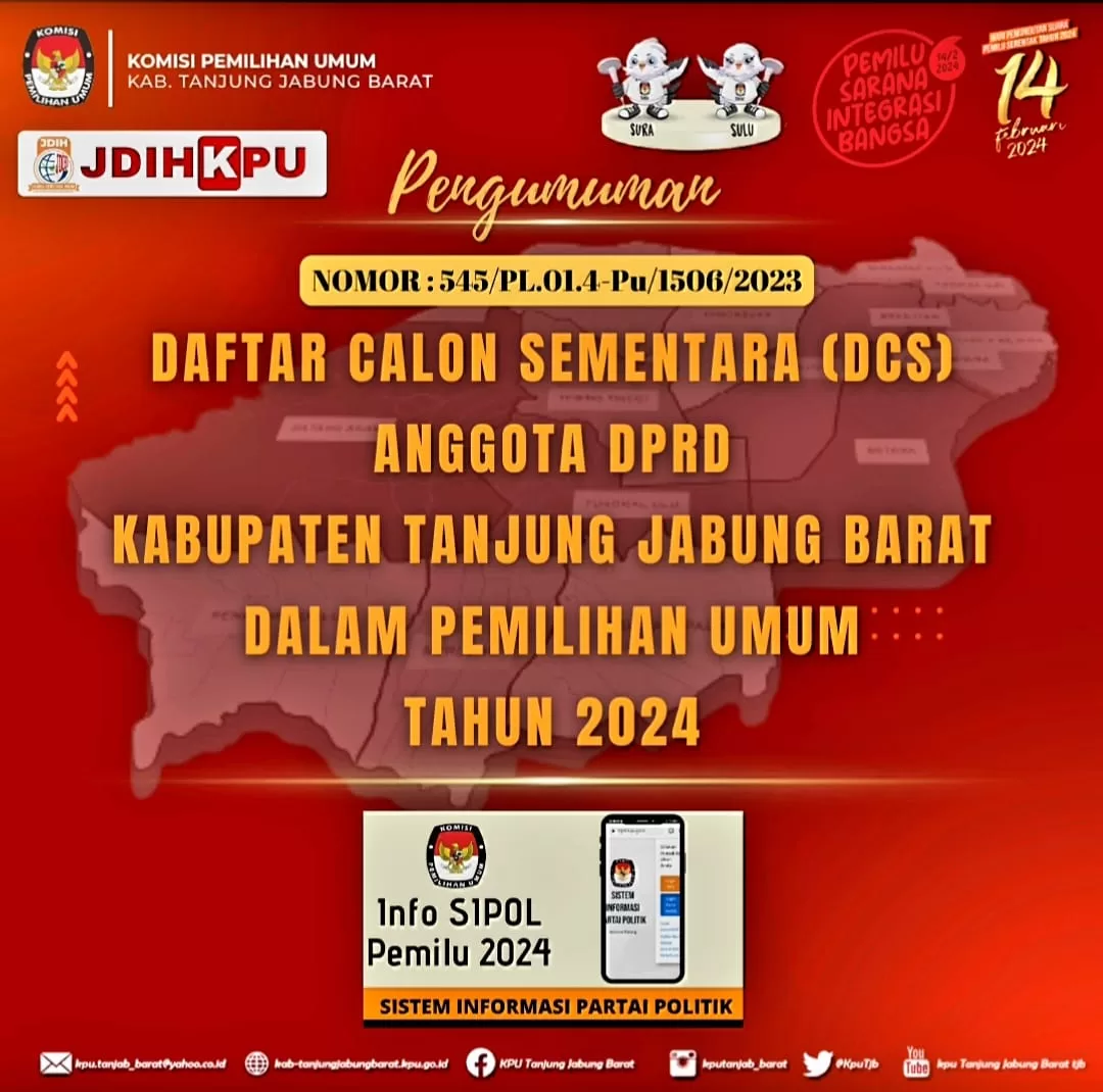 DCS tersebut tertuang dalam Pengumuman KPU Nomor : 545/PL.01.4-PU 1506/2023 tentang Daftar Calon Sementara Anggota DPRD Kabupaten Tanjung Jabung Barat Dalam Pemilihan Umum Tahun 2024.KPU juga memberi kesempatan kepada masyarakat untuk memberikan masukan dan tanggapan terhadap DCS yang disampaikan secara tertulis terkait dengan pemenuhan persyaratan administrasi bakal calon anggota DPR, DPRD Provinsi dan DPRD Kabupaten/Kota.