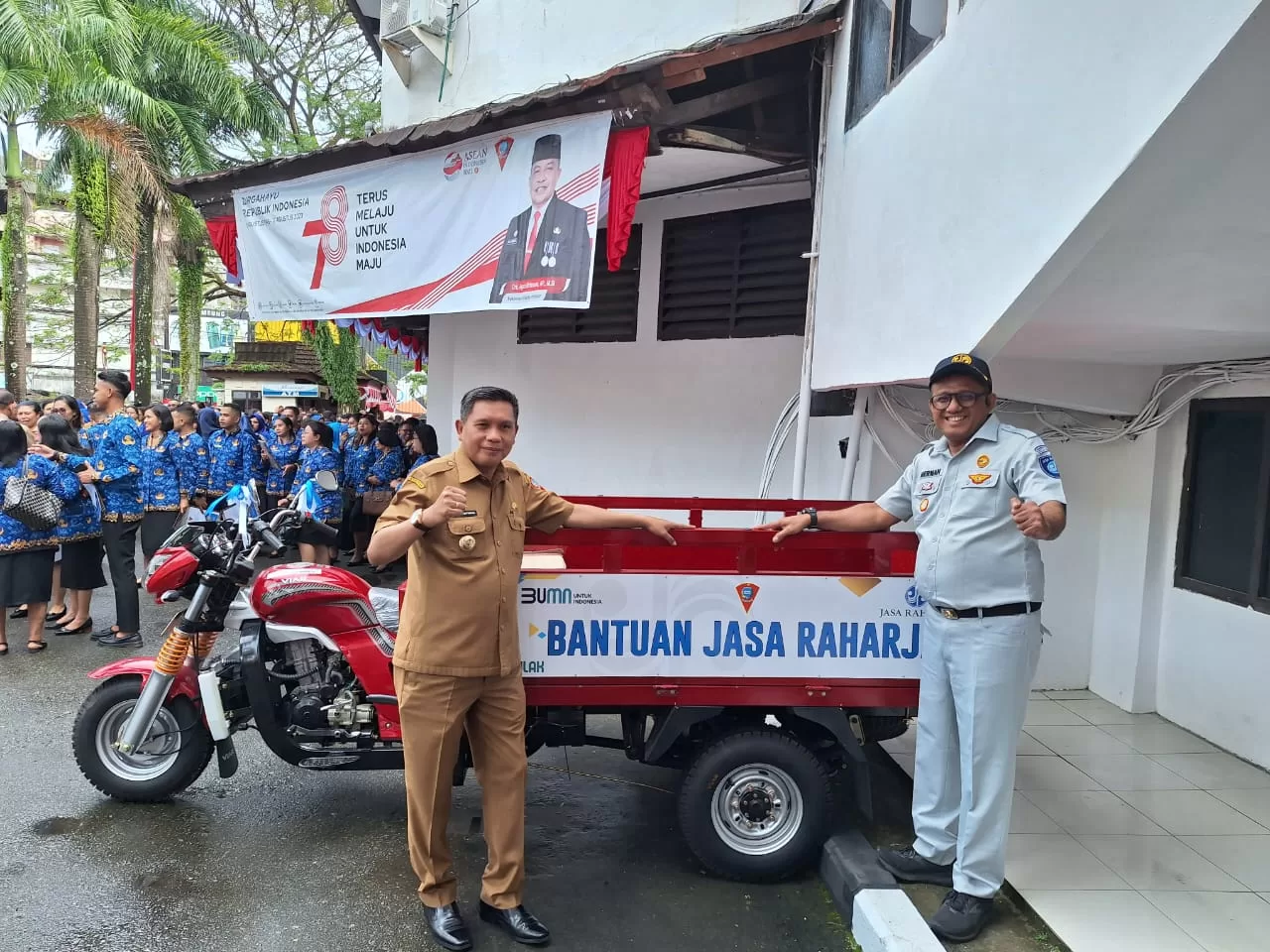 InvestigasiMabes.Com | Ambon – Membantu penanganan masalah persampahan di Kota Ambon, PT Jasa Raharja Cabang Maluku menyerahan bantuan kendaraan roda tiga pengangkut sampah kepada Pemerintah Kota Ambon pada hari Senin (28/08/2023) di Kantor Walikota Kota Ambon.Bantuan kendaraan roda tiga pengangkut sampah ini merupakan salah satu Penyaluran Bantuan TJSL Cabang Maluku yang secara simbolis di serahkan oleh Kepala PT Jasa Raharja Cabang Maluku Bapak Herman Haurissa dan diterima secara langsung oleh Penjabat Walikota Ambon Bapak Bodewin Wattimena bertepatan dengan Apel pagi pegawai di lingkup Pemerintah Kota Ambon.
