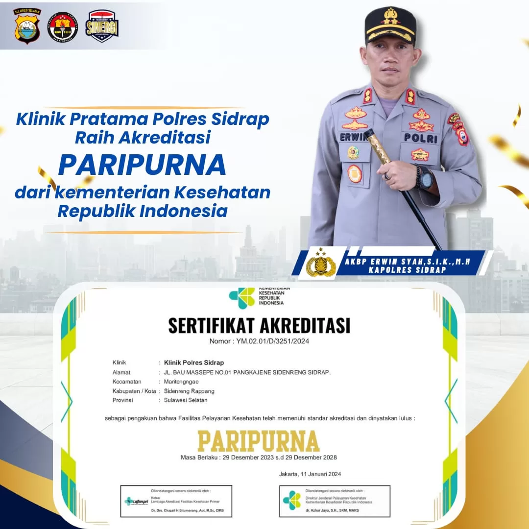 InvestigasiMabes.com | Sidrap - Di bawah kepemimpinan Kapolres Sidrap AKBP Erwin Syah, S.I.K.M.H, Klinik Pratama Polres Sidrap yang terletak di Jalan Bau Maseppe No 01 Kelurahan Pangkajene, Kecamatan Maritengngae, Kabupaten Sidrap, berhasil meraih Akreditasi Paripurna dari Kementerian Kesehatan Republik Indonesia.