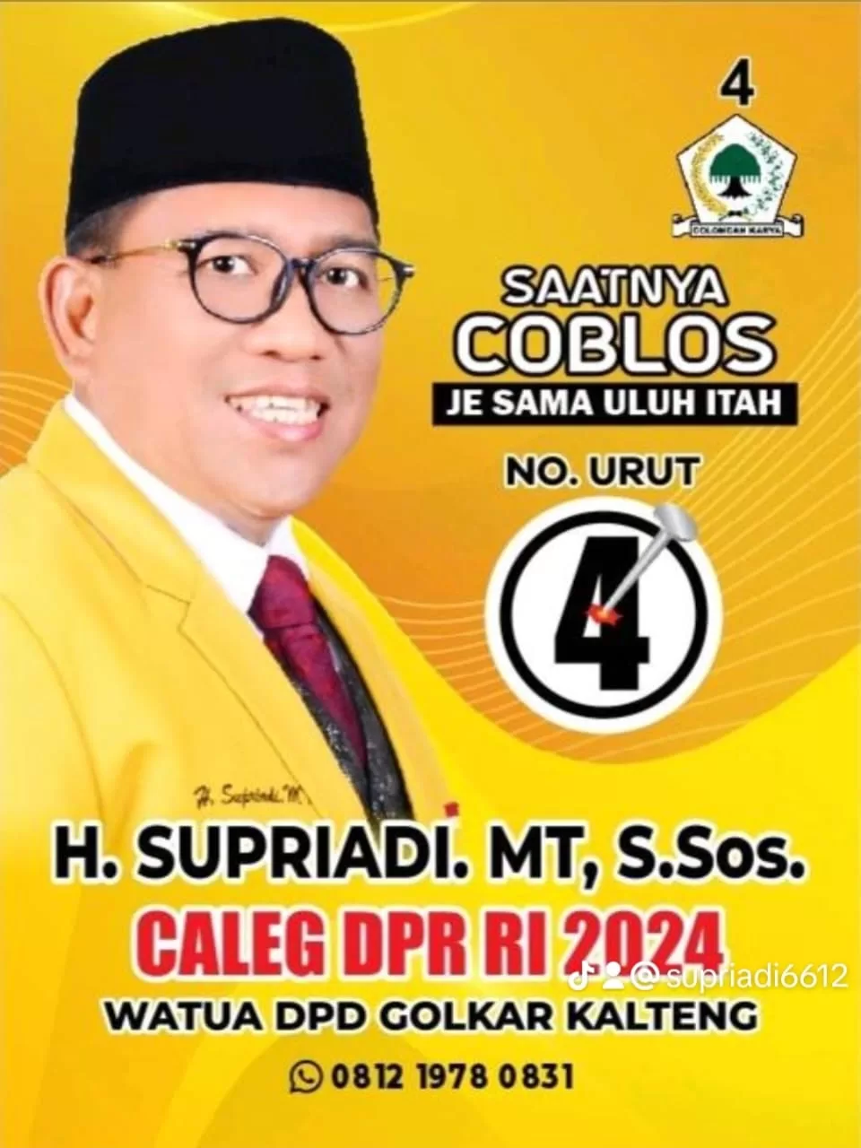 Beliau adalah H.Supriadi, MT, S.Sos adalah salah satu Caleg DPR RI Dapil Kalimantan Tengah dari Partai Golkar siap dan bahkan akan pasang badan untuk memperjuangkan Aspirasi Rakyat untuk mencapai kesejahteraannya dan kemakmuran masyarakat Kalteng pada Umumnya,saat di konfirmasi melalui WhatsApp pada tanggal 15/01/2024.