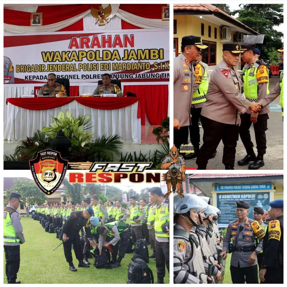 “Pimpinan di setiap tingkatkan harus terjun langsung ke lapangan untuk melakukan pengawasan melekat kepada anggotanya masing-masing. Lakukan pengaturan jadwal pengamanan, sehingga kesehatan personel selalu dalam kondisi yang prima. Hal ini penting, mengingat tahapan pencoblosan semakin dekat pada tanggal 14 Februari 2024," ujar Alumni Akpol 1991 ini.Ditambahkan Brigjen Pol. Edi Mardianto, Kedepankan komunikasi publik dan upaya cooling system, agar masyarakat berpartisipasi penuh dalam mendukung penyelenggaraan pemilu 2024 dan terhindar dari polarisasi. Tingkatkan sinergitas dan solidaritas antar seluruh personel pengamanan maupun stakeholder terkait, karena hal tersebut adalah kunci utama keberhasilan operasi.Sebelumnya, AKBP Heri Supriawan mengucapkan terima kasih atas kehadiran Wakapolda Jambi. Kunjungan Wakapolda Jambi ini, tambah Heri Supriawan, memberikan semangat serta motivasi kepada jajaran Polres Tanjabtim. Terutama dalam waktu dekat akan melaksanakan pengamanan pemilu, khususnya terkait dengan pengamanan TPS.Dijelaskan Heri Supriawan, Kabupaten Tanjabtim memiliki luas sekitar 5 ribu km² dengan jumlah penduduk sekitar 377 ribu orang yang tersebar di 73 desa, 20 kelurahan serta 11 kecamatan.