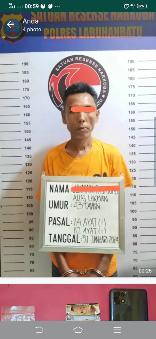 InvestigasiMabes.com l Labuhanbatu -- Satres Narkoba Polres Labuhanbatu kembali ungkap kasus Narkoba, pada hari Selasa, tanggal 30 Januari 2024 Pkl.17.30.Wib di Dusun II Desa Bandar Lama Kecamatan Kualuh Selatan Kabupaten Labuhanbatu Utara.Pelaku berinisial LP Alias LUKMAN, laki-laki, Islam, Bandar Lama, 43 thn, alamat Dusun I Desa Bandar Lama Kecamatan Kualuh Selatan Kabupaten Labuhanbatu Utara.