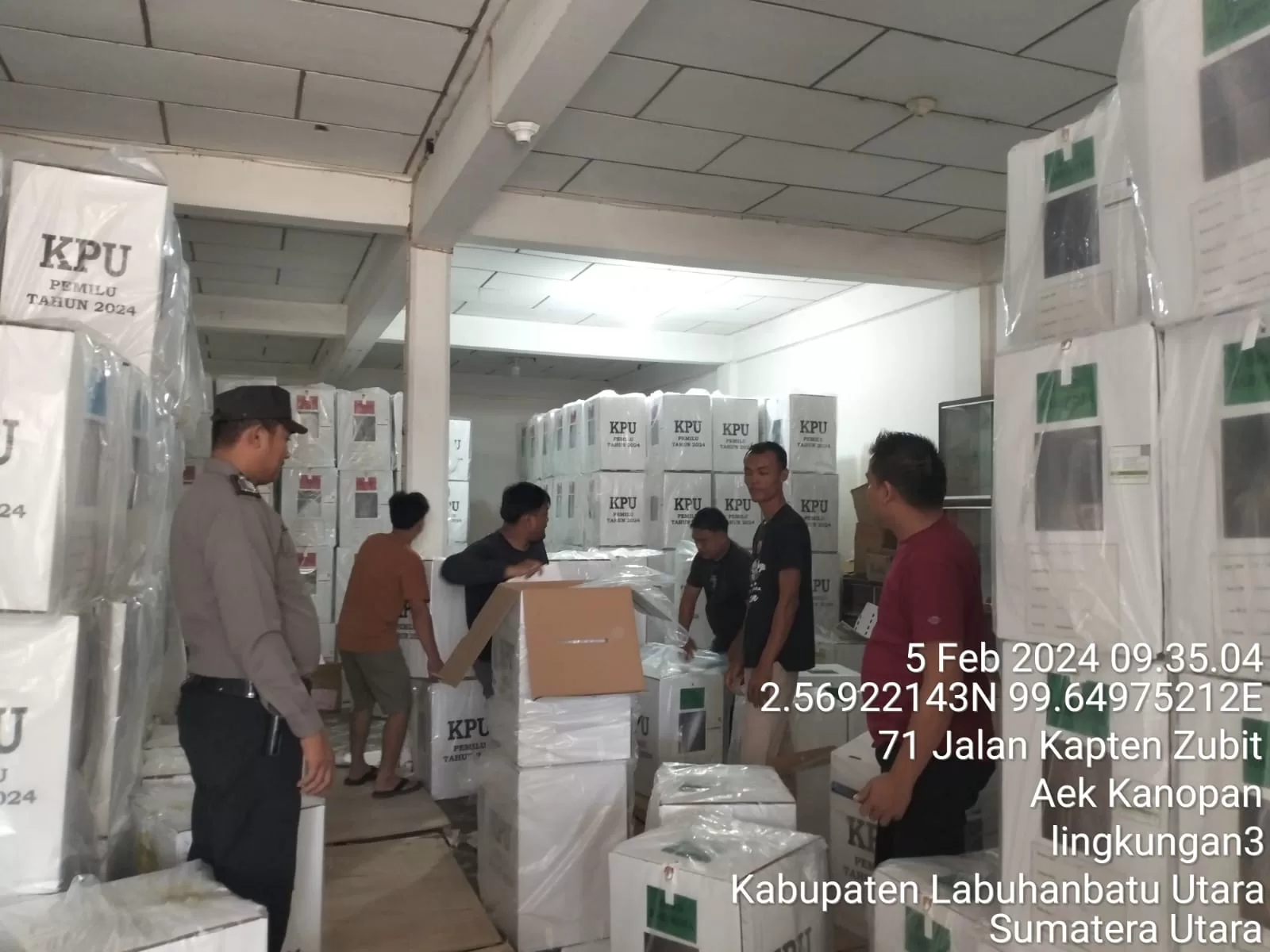 InvestigasiMabes.com l Labuhanbatu Utara -- Dalam rangka menjaga kelancaran proses Pemilihan Umum (Pemilu) yang semakin mendekat, personel polres labuhanbatu melaksanakan pengamanan Gudang Logistik, Pengesetan,Pengepakan dan Pengemasan Logistik pemilu 2024 oleh KPU Kab. Labuhanbatu Utara.Kegiatan di Labuhanbatu Utara berlokasi di Gudang Logistik KPU Kab. Labuhanbatu Utara Jln Kapten Zubit No 66. Kel.Aek Kanopan Kec. Kualuh Hulu kab. Labuhanbatu Utara. Senin (05/02/24)