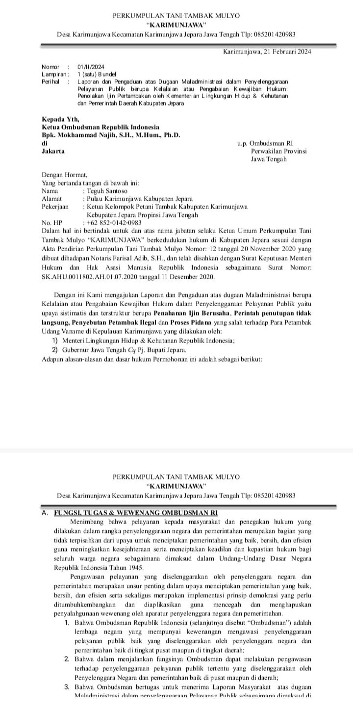 Aduan yang dilakukan ketua tani tambak mulyo ,dengan nomor surat 01/II /2024 sebanyak 16 Halaman satu bandel . Surat aduan tertanggal 21 Februari 2024 ditanda tangani Teguh Santosa . Adapun surat yang sempat diterima oleh awak media. Terkait petani tambak udang vaname yang menyoal adanya Maladministrasi dilakukan oleh pejabat pemerintah serta aparatur pemerintah baik dari pusat maupun daerah.