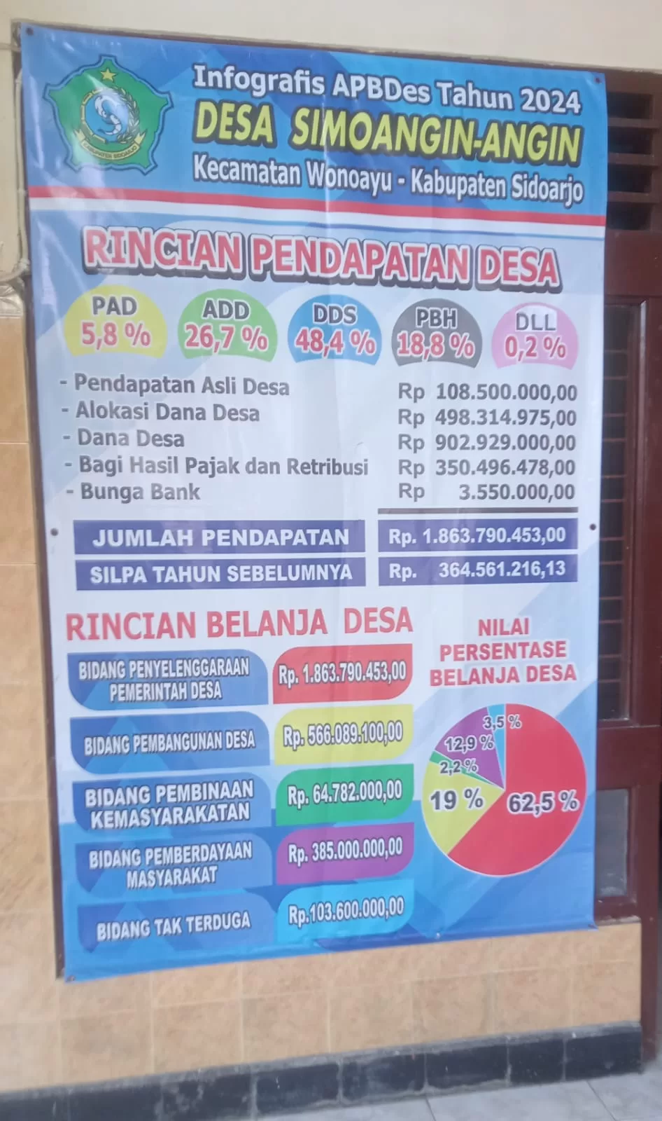 InvestigasiMabes.com | Sidoarjo - Pemasangan Baliho APBDes 2024 Meningkatkan Transparansi Keuangan Desa Simoangin-angin, kecamatan Wonoayu, kabupaten Sidoarjo, dalam meningkatkan transparansi pengelolaan keuangan desa.