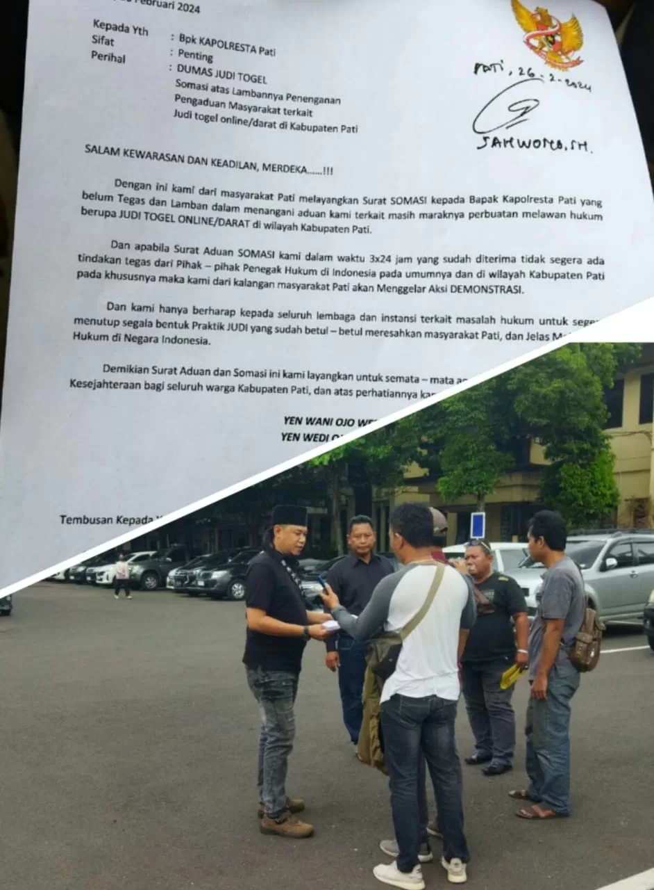 Tapi dengan segala peraturan dan ancaman bagi pelaku tak sedikitpun membuat takut para pelakunya.Ini terbukti dengan adanya perwakilan yang mengatasnamakan dari aliansi masyarakat ( 26/2/2024) mendatangi Mapolresta Pati untuk memberikan somasi ke Kapolresta terkait masih maraknya praktek perjudian togel di kabupaten Pati.