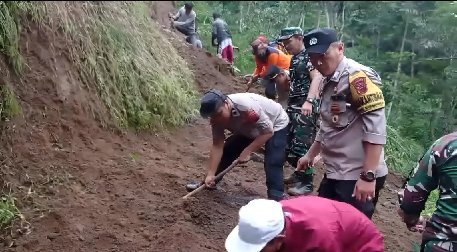 Disampaikan bahwa adanya kejadian tersebut pada hari ini tim gabungan melakukan kerja bakti membersihkan longsor di lokasi tersebut. Kerja bakti dilaksanakan TNI, Polri, BPBD dan masyarakat desa setempat."Pembersihan tanah longsor dilakukan untuk membuka akses jalan penghubung dua dusun. Sehingga bisa digunakan masyarakat beraktivitas," jelasnya.Kapolsek menambahkan berkat kerja sama tim gabungan TNI, Polri, BPBD dan masyarakat jalan tertutup longsor berhasil dibersihkan. Jalan setapak tersebut dapat kembali digunakan untuk beraktivitas masyarakat."Walaupun sudah bisa dilewati, kami mengimbau kepada masyarakat untuk berhati-hati saat melintas. Mengingat cuaca masih sering hujan berpotensi terjadi longsor susulan," pungkasnya. (Red).