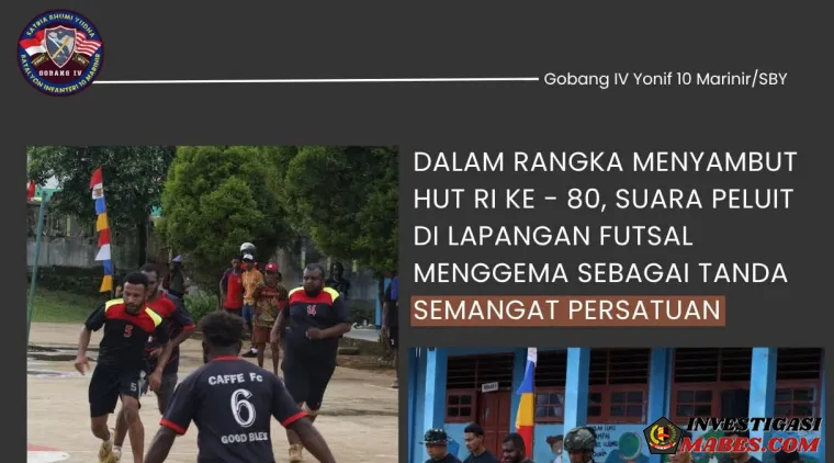 InvestigasiMabes.com l Papua Barat Daya - TNI AL Dispen Kormar (Brigif 4 Marinir/BS). Dalam rangka menyambut HUT ke-80 Kemerdekaan Republik Indonesia, Satgas Pamtas RI–PNG Mobile Gobang IV Yonif 10 Marinir/SBY menggelar turnamen futsal yang meriah di Kampung Susumuk, Kabupaten Maybrat. Jumat (01/08/2025).