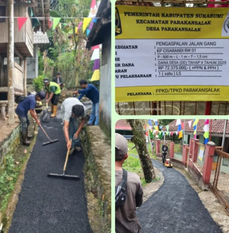 InvestigasiMabes.com l Sukabumi --Pemerintah Desa Parakasalak kecamatan Parakansalak Kabupaten Sukabumi Jawa Barat, telah merealisasikan Program Dana Desa (DD) dari Pemerintahan pusat Tahap II yakni Membangun Jalan lingkungan berupa pengaspalan di lokasi Kp. Cisarandi Rw 01 untuk dengan Volume P 500 m x L 1 m x T 1,5 m dikerjakan TPK desa Parakasalak dengan nominal dana Anggaran sebesar Rp. 72.375.000,-
