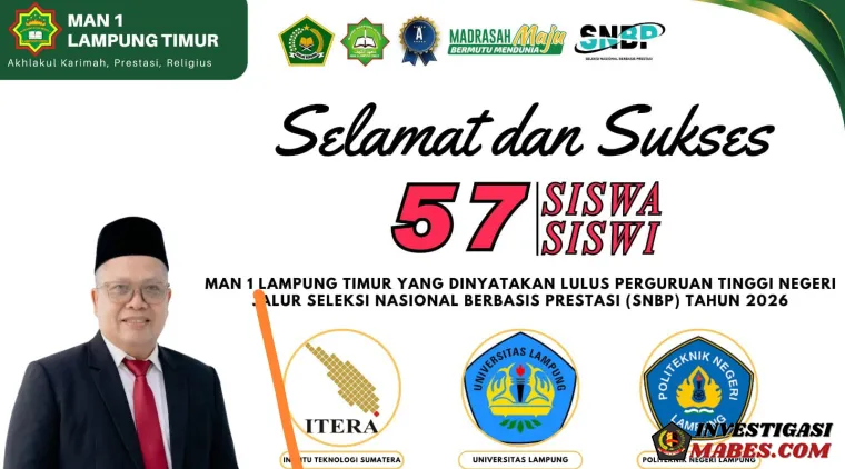 Investigasimabes.com l Lampung Timur -- Kabar membanggakan datang dari Madrasah Aliyah Negeri (MAN) 1 Lampung Timur. Sebanyak 57 peserta didik berhasil lulus dan diterima di berbagai Perguruan Tinggi Negeri (PTN) melalui jalur seleksi tahun 2026.