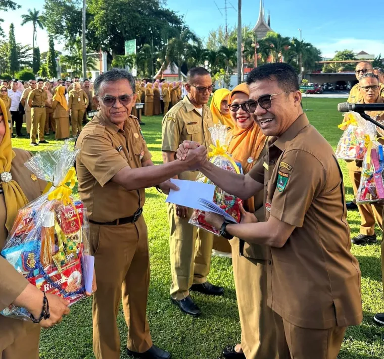 Sebanyak sembilan orang pegawai menerima reward berupa bingkisan dan uang tunai sebagai bentuk apresiasi atas komitmen dalam meningkatkan ibadah di bulan suci. Saat penyerahan reward yang dilaksanakan dalam rangkaian apel pagi di halaman Kantor Gubernur Sumbar, Senin (30/3/2026), kehadiran Sekdaprov Sumbar diwakili oleh Asisten Perekonomian dan Pembangunan Setdaprov Sumbar, Adib Alfikri.