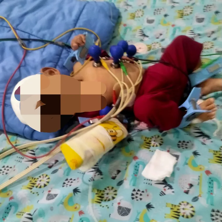 Tubuh kecilnya sudah menjalani 3 kali operasi besar di kepala, leher, dan perut bawah. Perban masih melilit kepalanya, kabel EKG menempel di dada, infus terpasang di tangan. Kondisi yang tak seharusnya dilalui bayi seusianya.