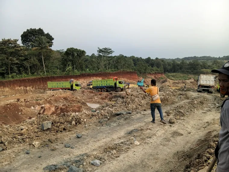 Berdasarkan pantauan di lokasi pada Minggu (19/4/2026), terlihat aktivitas pengangkutan tanah menggunakan sejumlah kendaraan, di antaranya dump truk besar dengan indeks 22 serta dump truk engkel dengan indeks 7 yang hilir mudik mengangkut material dari area galian.